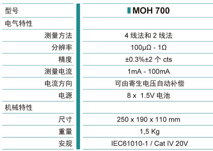 法国CA MOH 700 毫欧计/微电阻计5 种量程可选, 测量范围从0.1mΩ 到2000Ω,分辨率100μΩ 到1Ω(由量程决定),精度:0.3%±2cts,瞬时或稳定(60s) 测量,电压或电流回路不通则提示报警,HOLD 功能