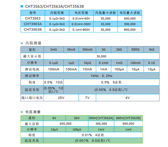 CHT3563 高精度电池内阻测试仪测试分辨率可达0.1uΩ、大测试电压可达60V,测试周期10mS。标配RS232C和HANDLER接口,可实现自动化测量,较快测试速度可达100次/