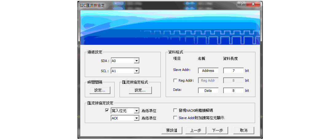 | 在步骤三确认总线协议后按下下一步,便会直接进入总线属性,确认脚位以及参数数据便完成整个总线协议的设定。 提示:每一种总线分析模块均有相对应的参数设定,使用者可在参数设定中依照待测总线内容加以设定。  |