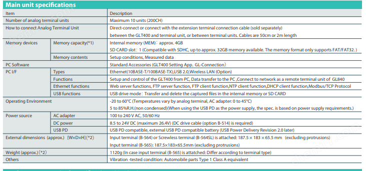 GLT400-564SL可扩展至200ch,可以增加传感器进行电压/温度/湿度/脉冲/逻辑的多元输入。采用快插式模块,方便快捷。还可以在超低温环境下使用。拥有7英寸的液晶宽屏清晰显示波形,具有警报输出的功能,USB驱动模式,导航功能;支持10ms间隔采样,支持大容量SD存储卡进行可信高的长时间的测量。