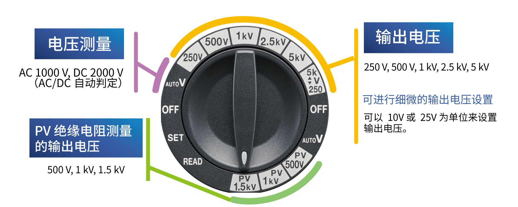 测量范围广,最大10 TΩ。用于测量高压设备(变压器、线缆、马达等)的绝缘电阻。增加了光伏发电系统测试而设计。这款5kV的绝缘电阻表能轻松应对2000V的光伏发电系统测试,帮助用户在数以万计的光伏面板中迅速锁定故障位置。
